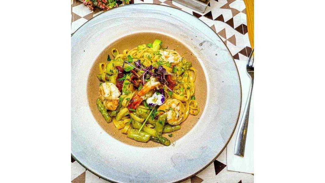 Paste tagliatelle, creveți, roșii confiate, sparanghel, dovlecel, busuioc și ulei de usturoi - 350g