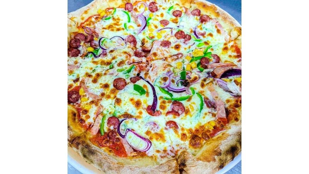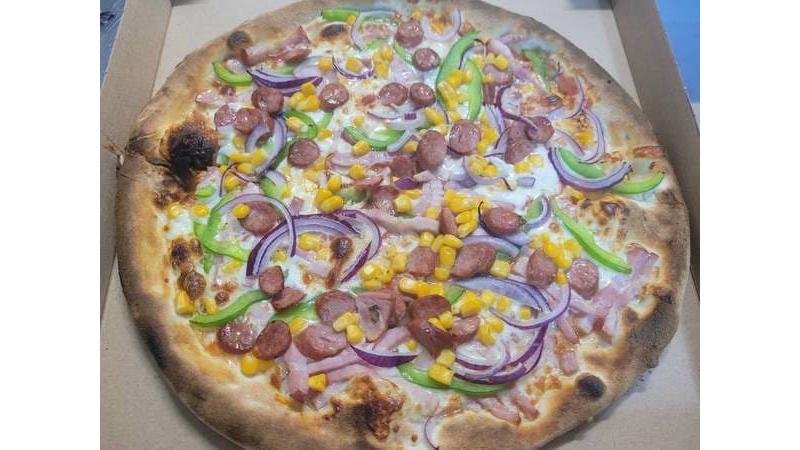 Bacon, cârnați, ceapă roșie, porumb, ardei gras, mozzarella, sos de roșii - 450g