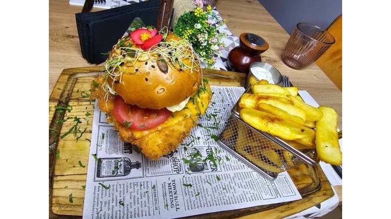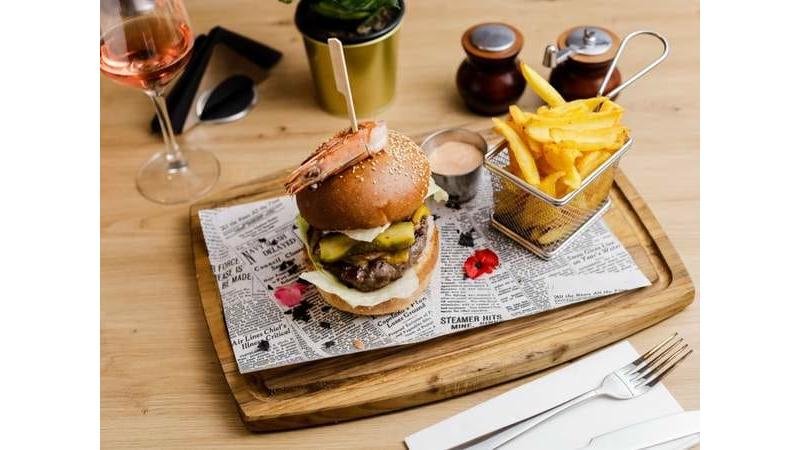 Burger de vită, creveţi, brânză cheddar topită, castraveţi murați, brânză cheddar, ceapă caramelizată, salată, roșie, cartofi prăjiți - 450g