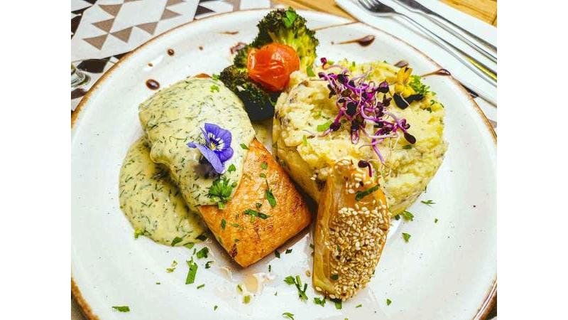 Filet de somon, piure de cartofi cu trufe, roșii cherry, broccoli, sos de vin alb și mărar - 320g