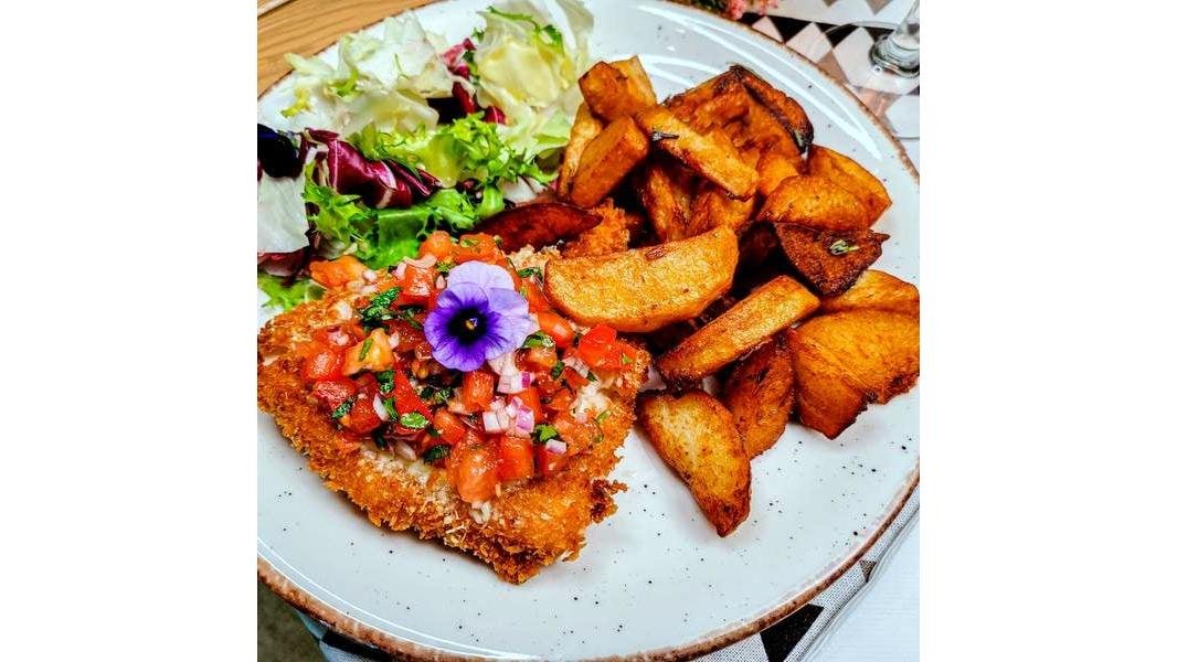 Piept de pui cu crustă panko, parmezan, mozzarella, roșii gratinate, cartofi Piatto și salată verde mixtă - 320g