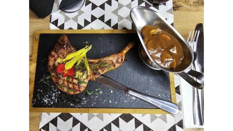 Antricot de vită, ceapă roșie, mix de ardei gras, usturoi, brânză cedar, cartofi prăjiți și ciabatta - 350g