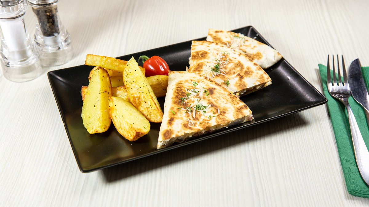 Tortilla, cașcaval, piept pui, smântână lichidă, garnitura la alegere 200/ 150/ 50 g