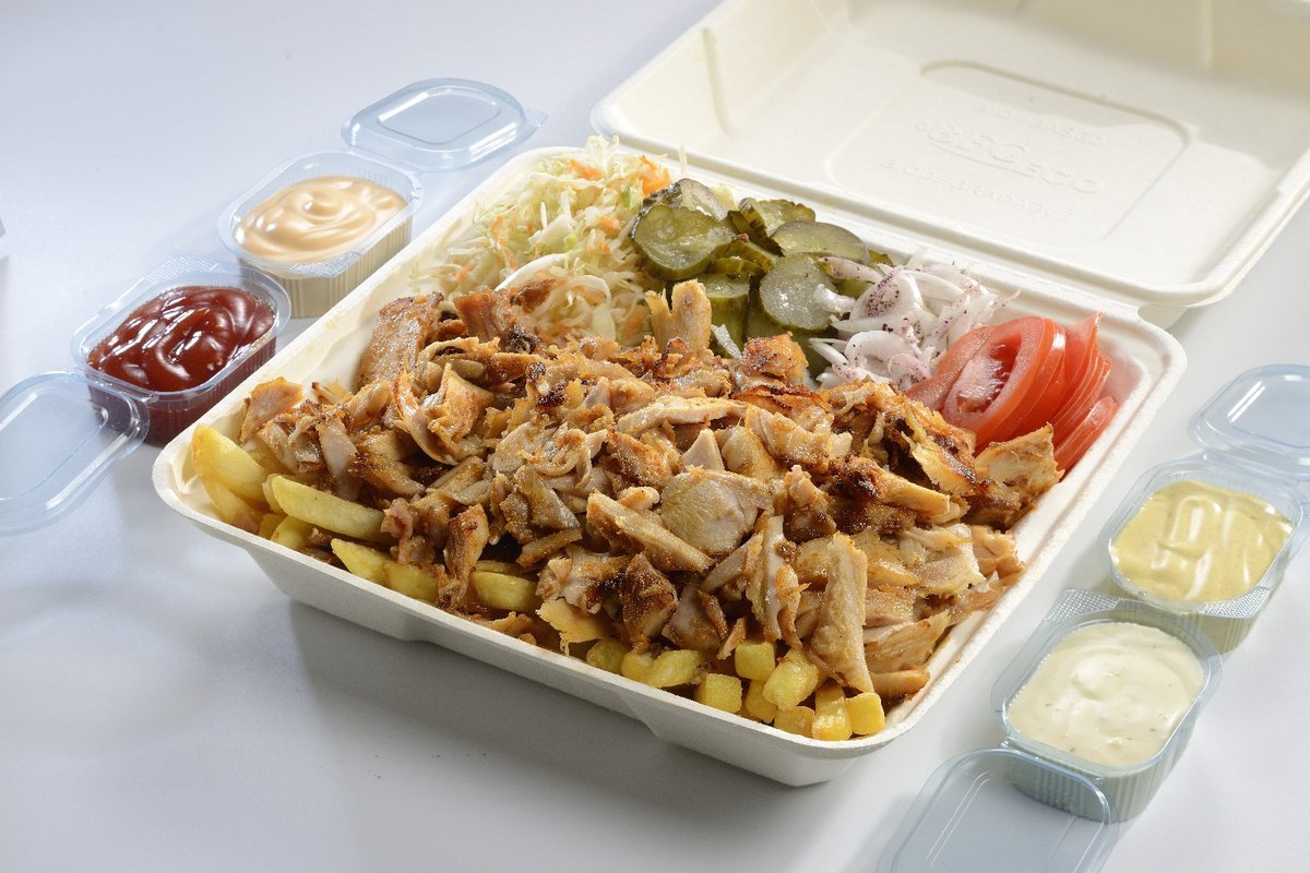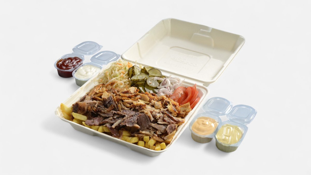 Lipie, cartofi, carne rotisata, mix de varza alba si rosie, rosii, castraveti murati, ceapa, patrunjel, sosuri la alegere.