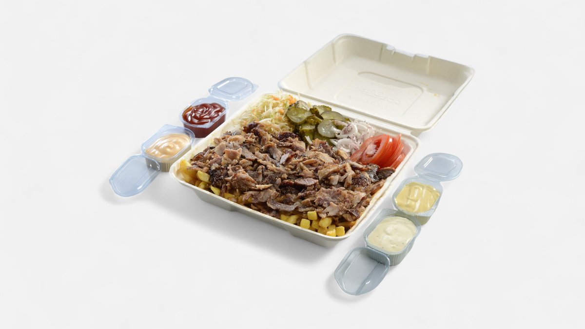 Carne de pui și vită, cartofi, varză, roșii, ceapă crudă și caramelizată, pătrunjel, castraveți murați, ardei iute, asezonată cu condimente diverse și sosuri la alegere: sos de usturoi, ketchup dulce, maioneză simplă, sos curry, sosul casei (maioneză cu sfeclă și condimente) sau sos Samurai MAXX