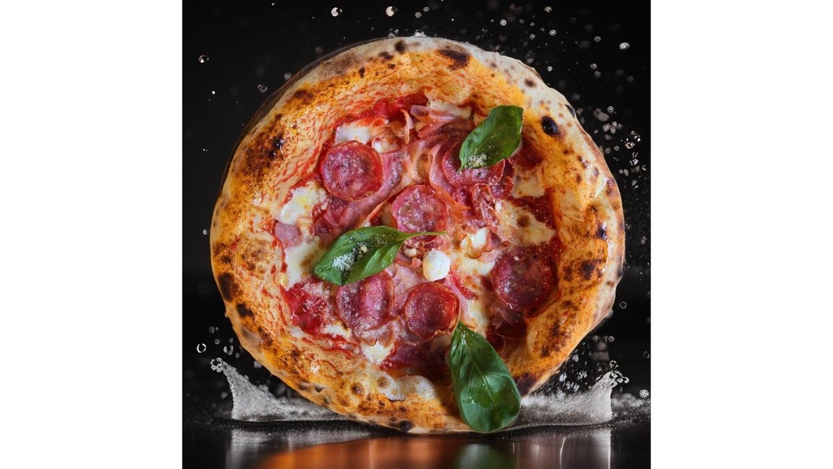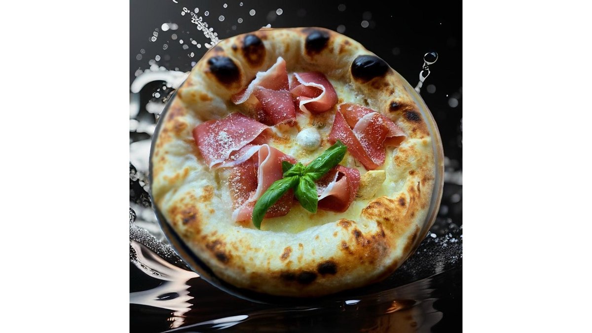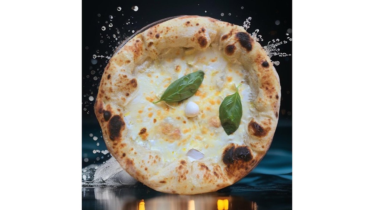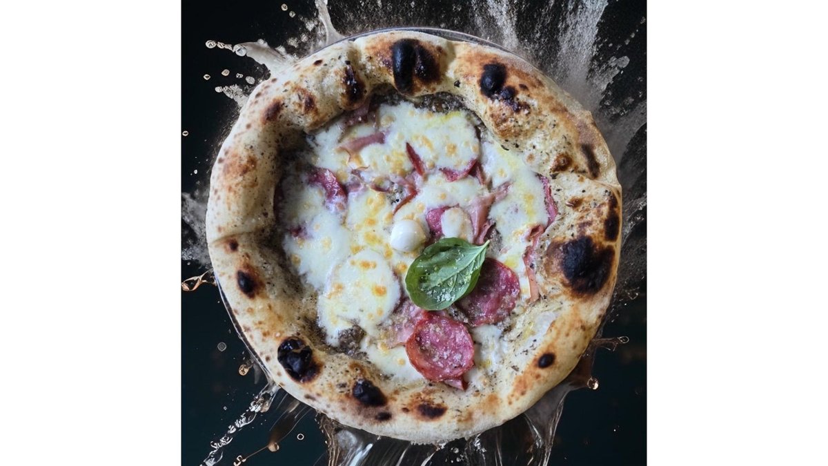 Blat de pizza napoletana, Fior di latte, Salam Napoli, Bacon, Crema philadelphia, Crema de trufe, Busuioc, Ulei cu trufe negre, Parmezan 620 gr