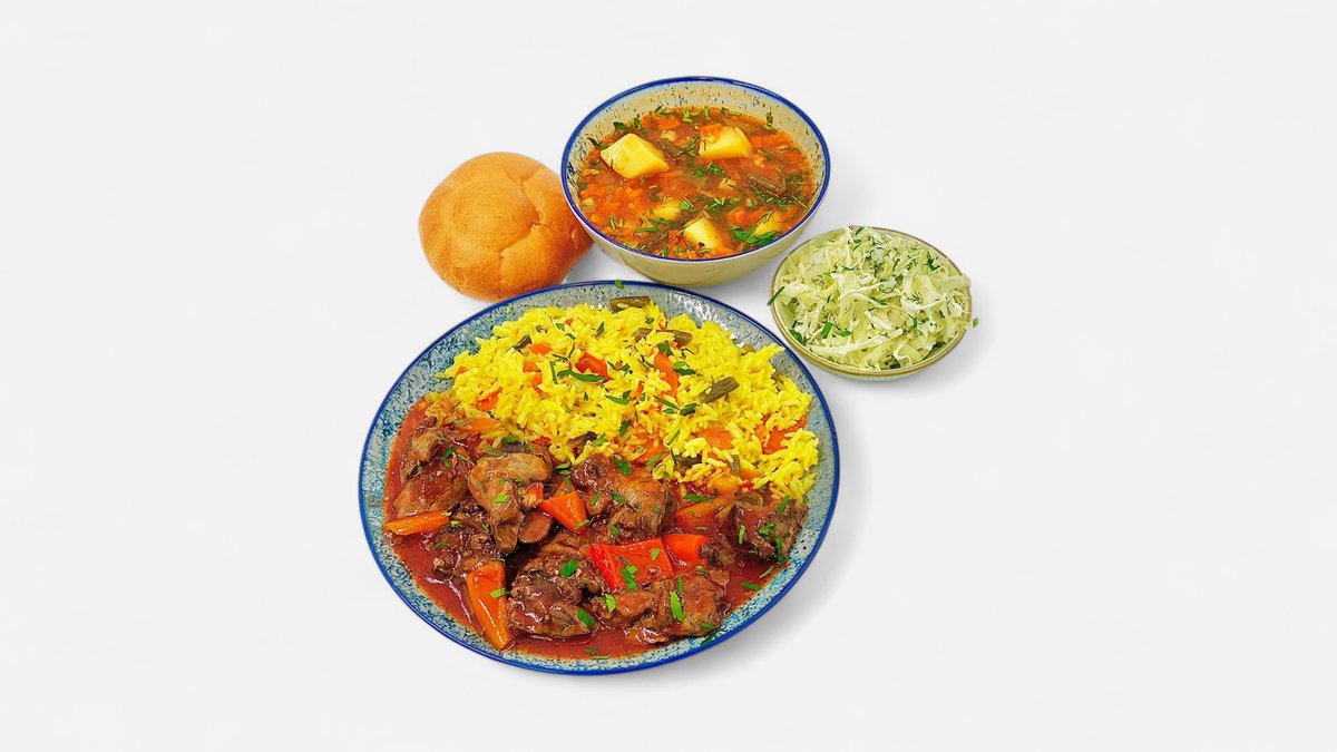 Ciorbă de legume 300 g Sau Supă de pui cu tăiței 300g/35g+ Parjoale de porc(2 buc – 120g) + Orez cu legume (200g) + Salată de varză (130g) + Chiflă (1 buc - 50g)