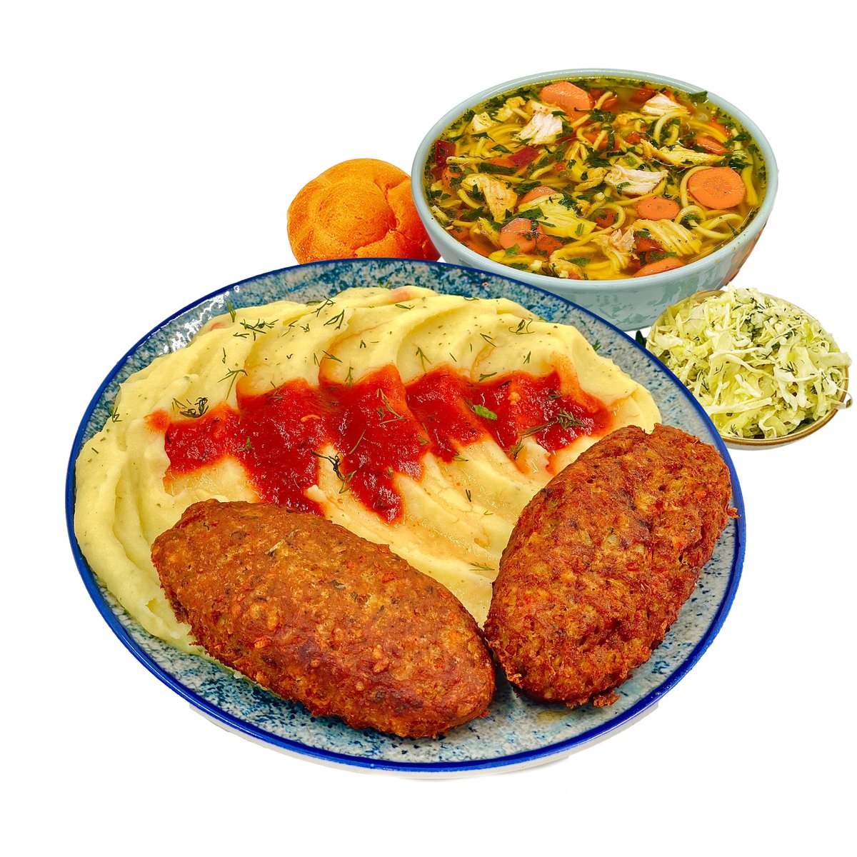 Ciorbă de legume 300 g Sau Supă de pui cu tăiței 300g/35g+ Panko șnițel pui (1 buc - 120g)+ Piure cartofi (fulgi carto) 250g + Salată de varză (130g) + Chiflă (1 buc - 50g)