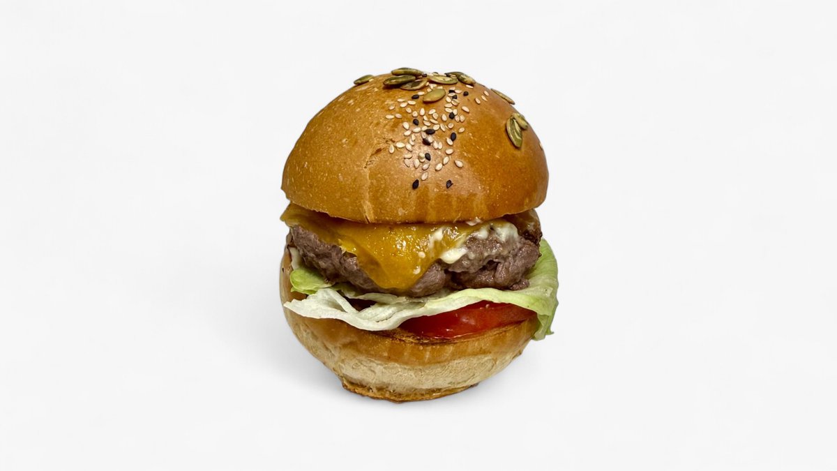 Ingrediente: Carne de vita black angus 180 g, branza cheddar 60 g, branza brie 30 g, ceapa caramelizata 15 g, castraveti murati 20 g, rosii 20 g, salata mix 20 g, sos calypso 15 g, chifla 15 g