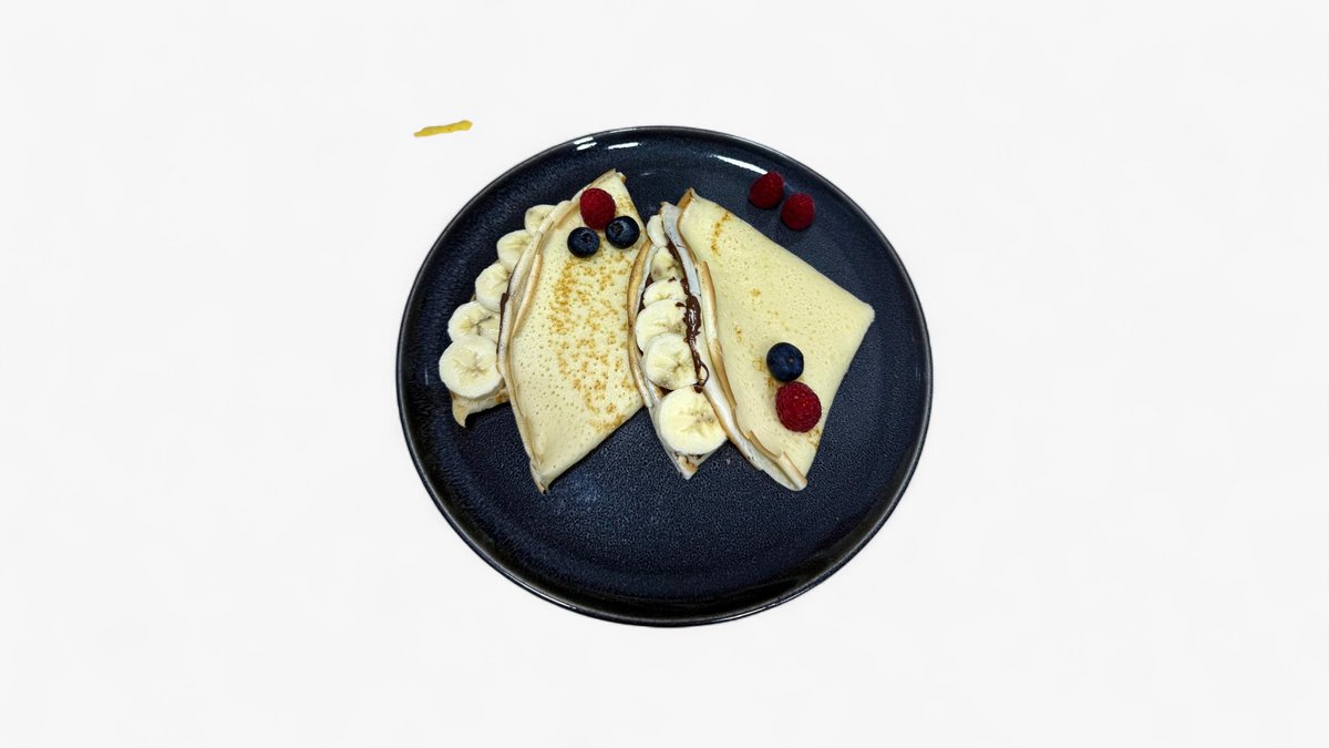 Ingrediente: Oua 13,5 g, zahar vanilat 1,3 g, esenta de vanilie 1 ml, sare 0,5 g, apa minerala 18 ml, lapte 27 ml, faina 18 g, unt 2,70 g, nutella 30 g, banana 100 g