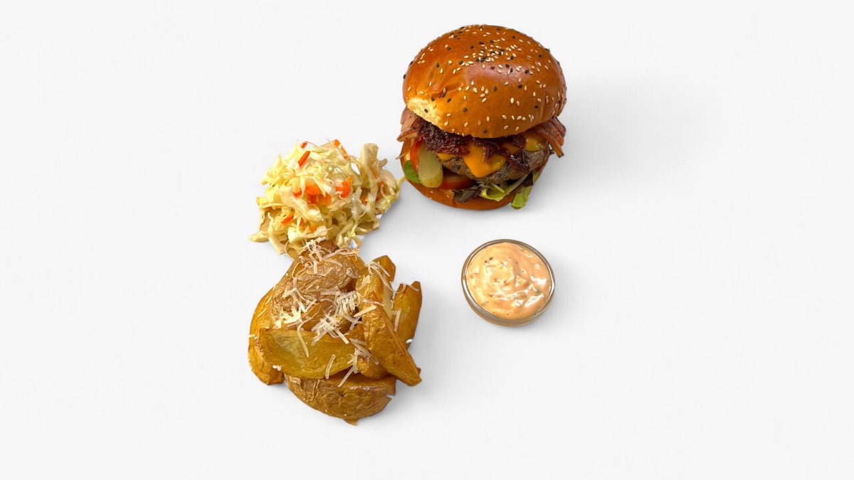 Ingrediente: Cheese Burger (375 g) cartofi weddges (100 g) + Salata de varza (40 g) + Sos de usturoi (30 g)