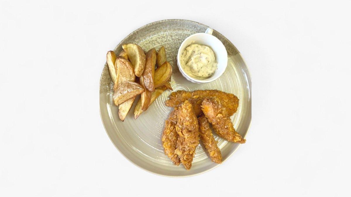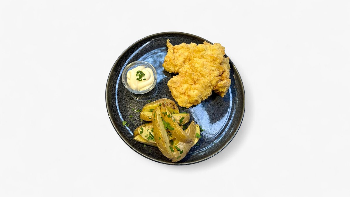 Ingrediente: Muschiulet pui 200g, sos soya 20 ml, oua 40 g, lapte 30 ml, panko, pesmet, faina, fulgi porumb, sare 2 g, cartofi weddges 100 g, sos usturoi 50 g