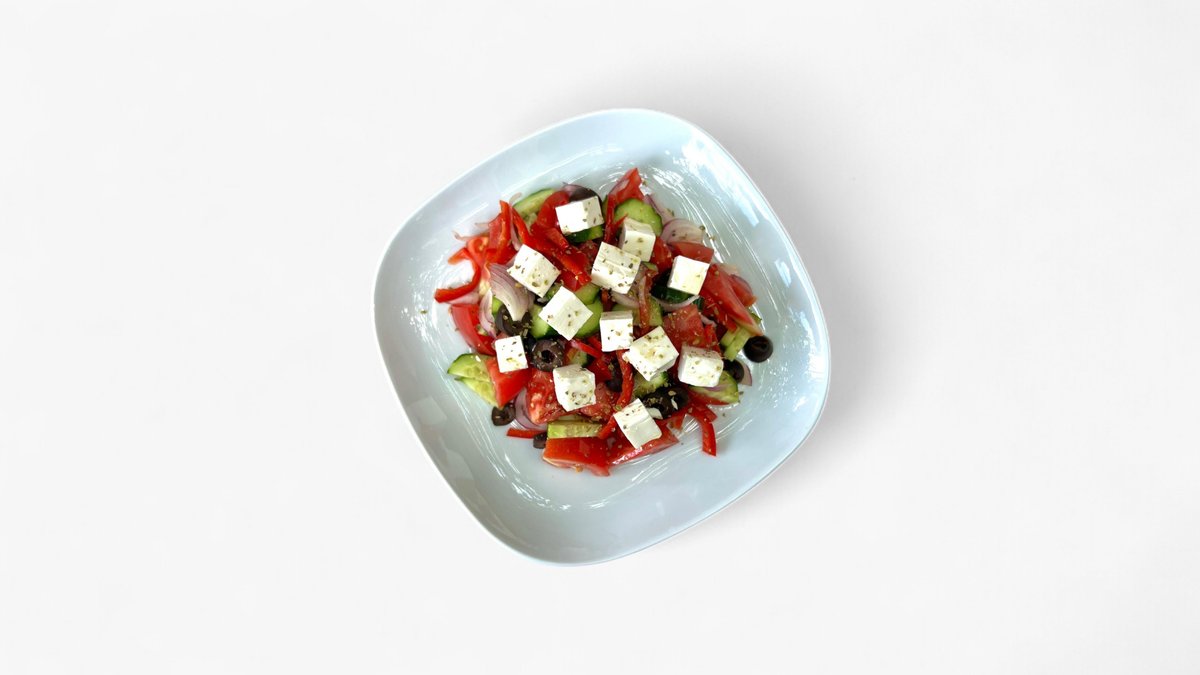 Ingrediente: Rosii 230 g, castravete 100g, masline 40 g, ardei kapia 50 g, ceapa rosie 35 g, branza feta 80 g, ulei de masline 10 ml, oregano 4g