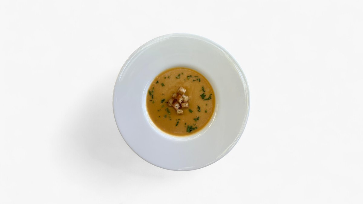 Ingrediente: Apa 250 ml, ceapa 30 g, morcov 30 g, telina 15 g, pastarnac 10 g, usturoi 10 g, cartof dulce 40 g, smantana de gatit 15 ml, sare 3 g, piper 2 g, ulei de floarea soarelui 8 ml, crutoane 40 g