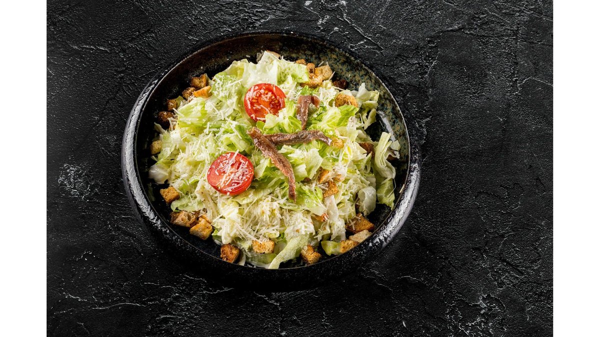 Salata iceberg, Creveti, crutoane, file de anchois marinata, fasii de parmezan, amestecate cu un cremos dressing Caesar 400g