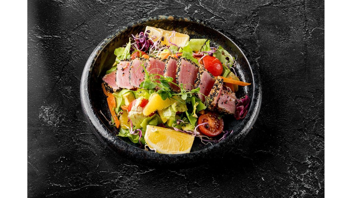 Ton proaspat in crusta de susan, salata dulce crocanta, avocado, rosii cherry si segmenti de portocala 400g