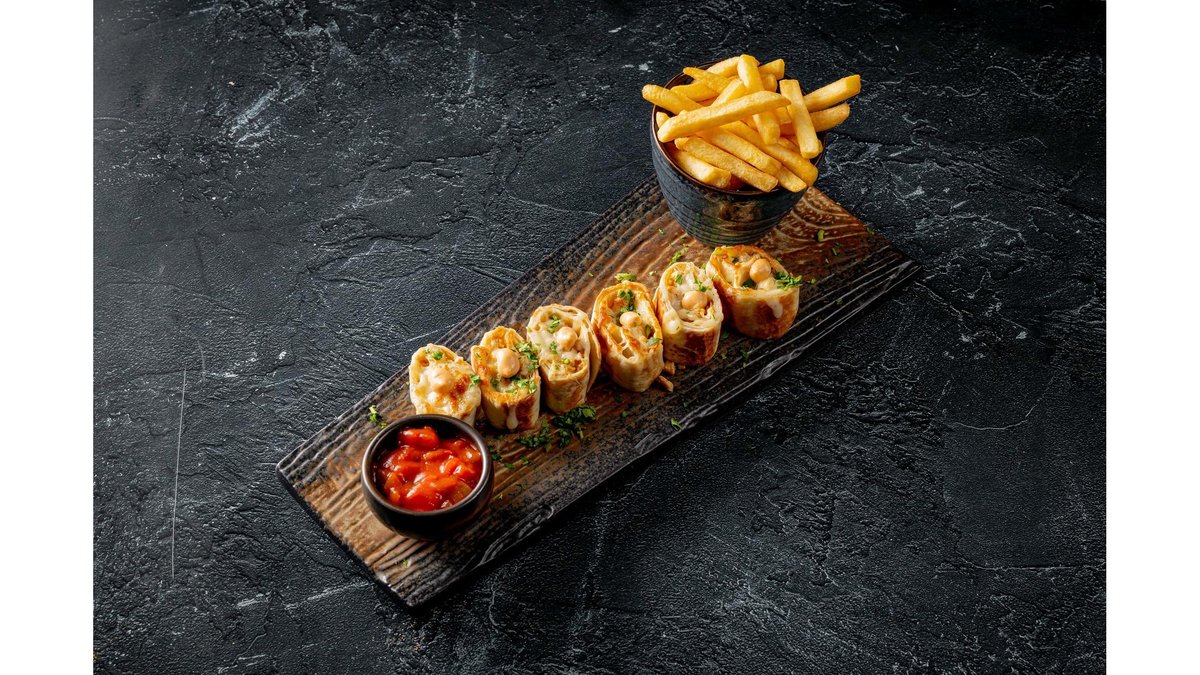 Tortillas, branza cheddar, piept de pui, ceapa rosie, impreuna cu cartofi prajiti si sos salsa 450g