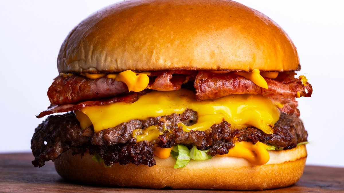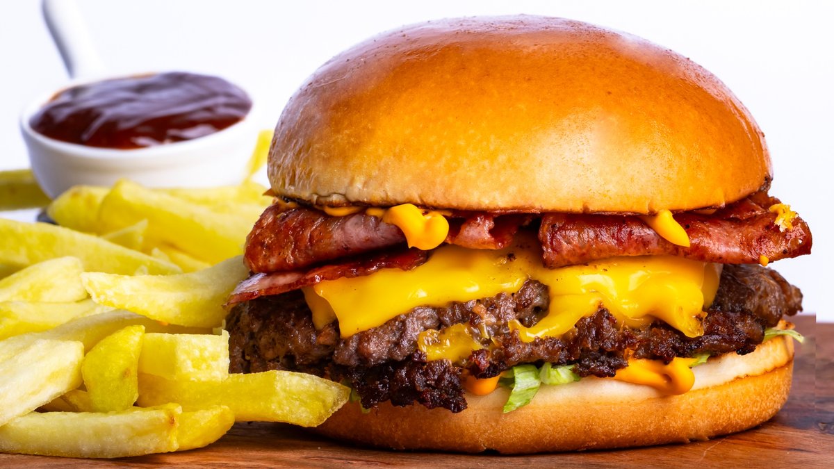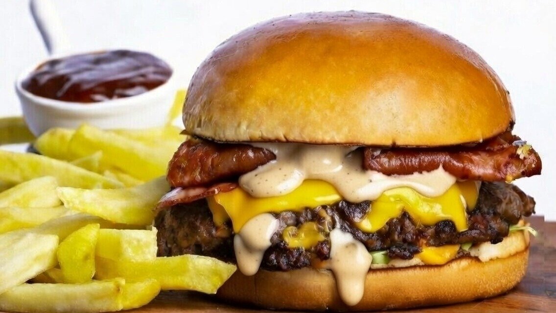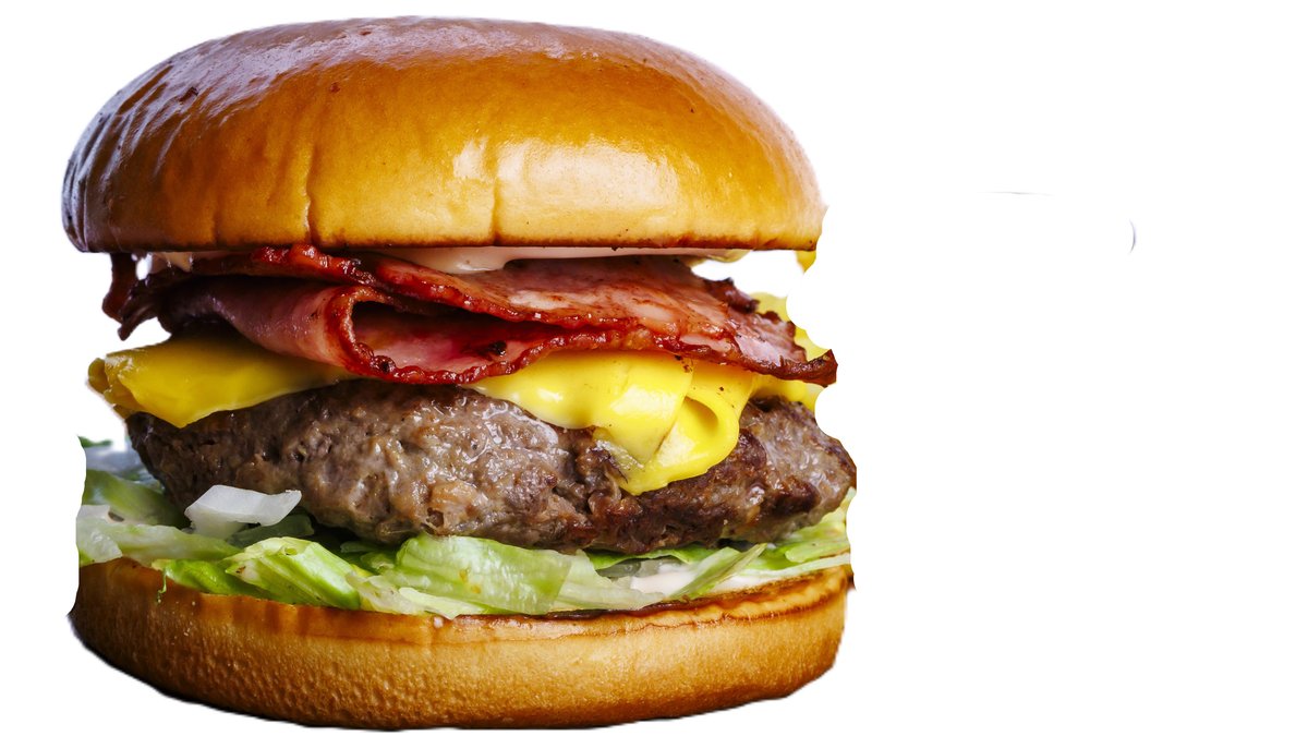 520g Chiflă artizanală 85 g, carne de vită 100% naturală 150 g, bacon dublu 40 g, brânză cheddar dublu 40 g, ceapă caramelizată 10g, salată iceberg 20g, sos burger 50 g, sos la alegere 60g, garnitură la alegere 150g
