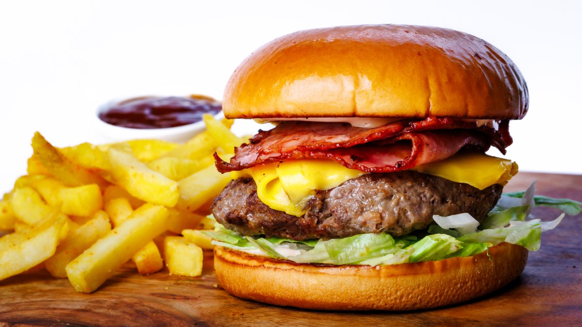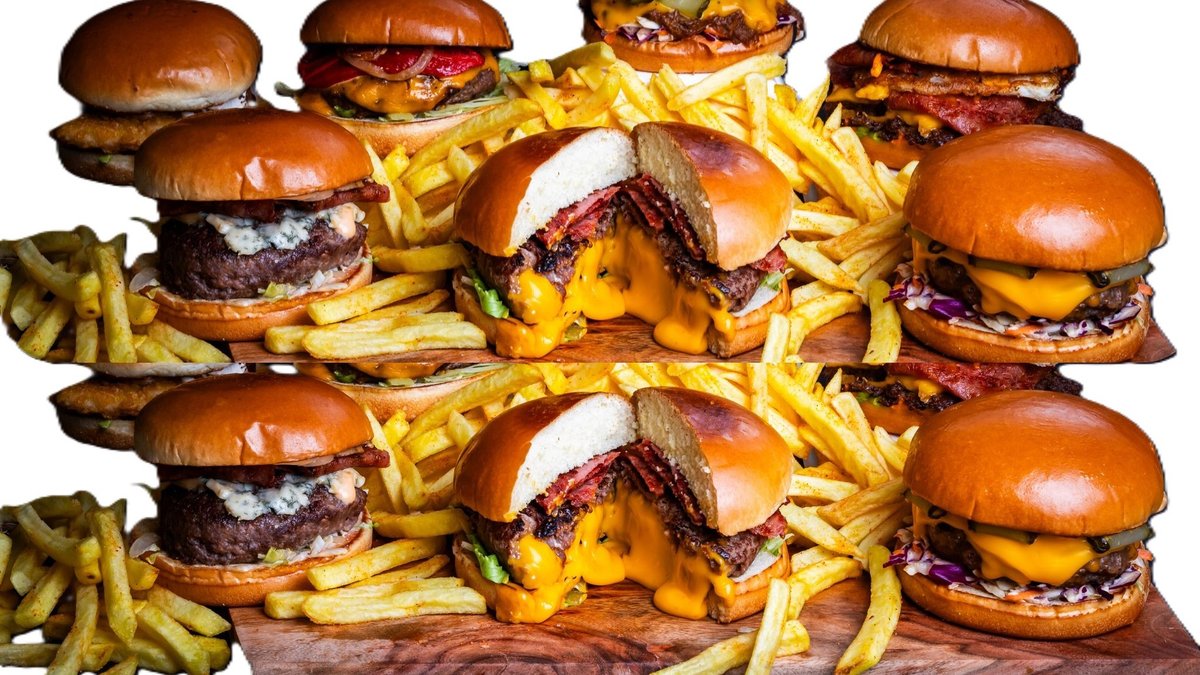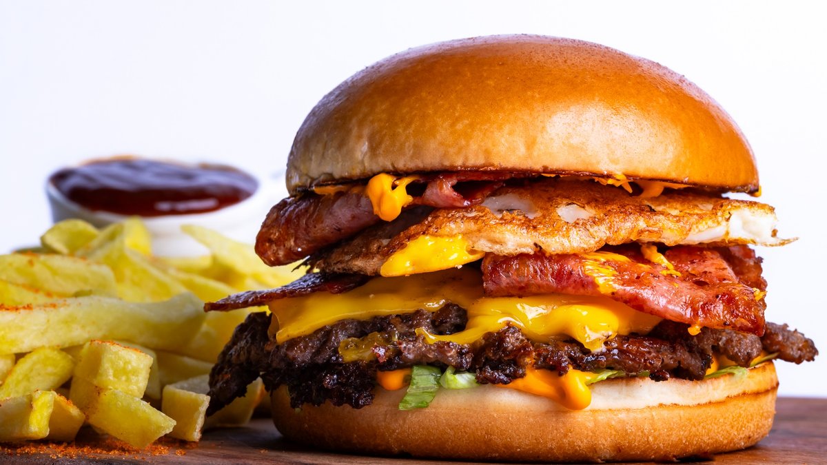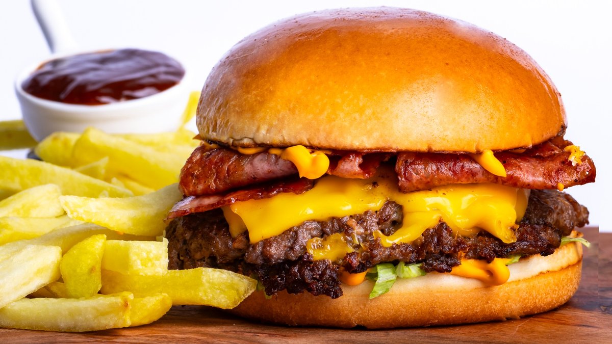 520g Chiflă artizanală 85 g, carne de vită 100% naturală 150 g, bacon dublu 40 g, brânză cheddar dublu 40 g, ceapă caramelizată 10g, salată iceberg 20g, sos burger 50 g, sos la alegere 60g, garnitură la alegere 150g