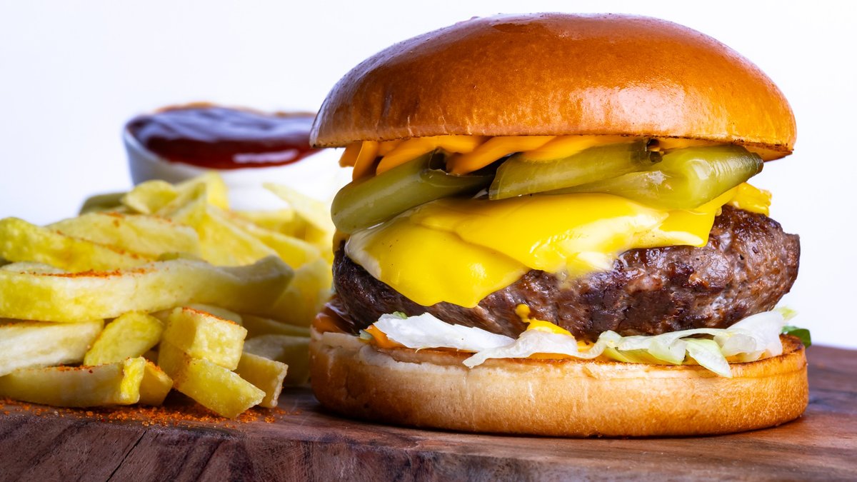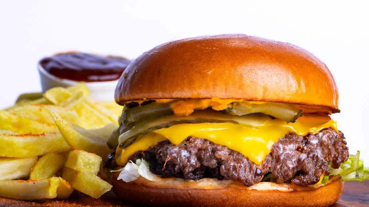 520g Chiflă artizanală 85 g, carne de vită 100% naturală 150 g, brânză cheddar dublu 40g, salată iceberg 20 g, castraveți murați 20g, sos burger 50 g, sos la alegere 60g, garnitură la alegere 150g
