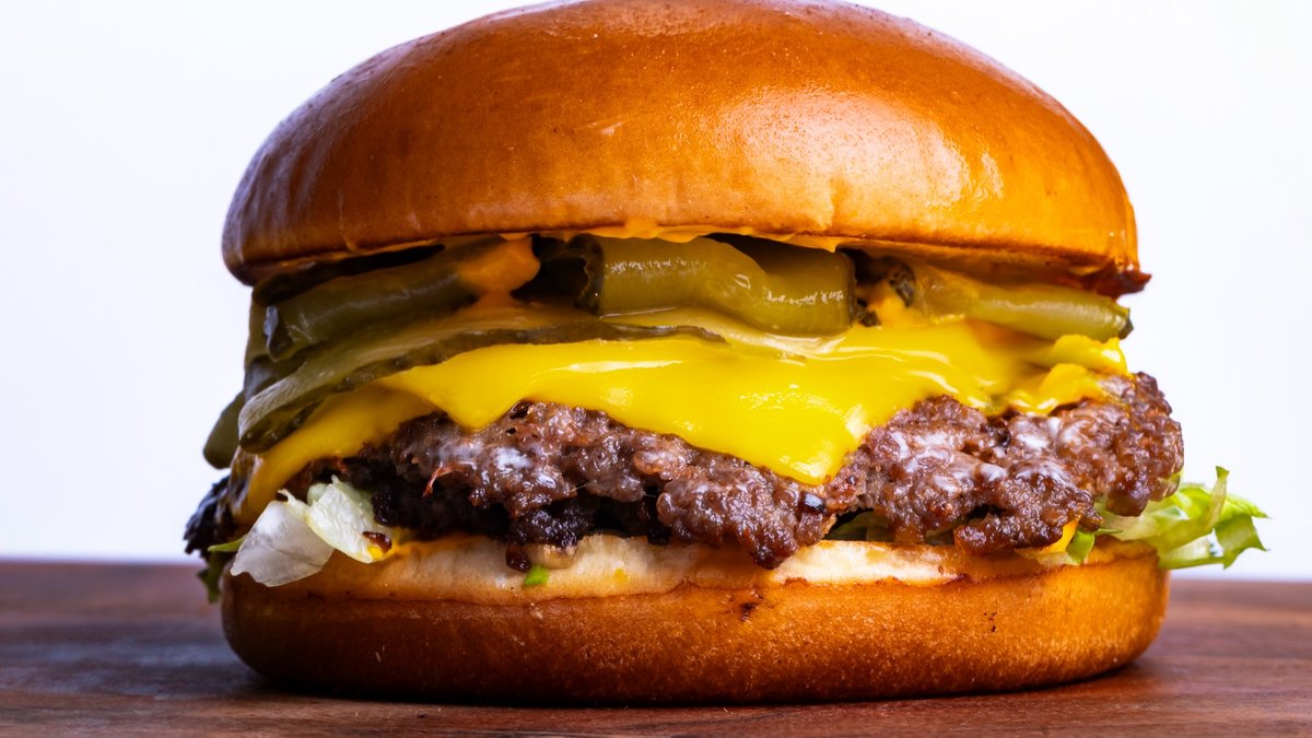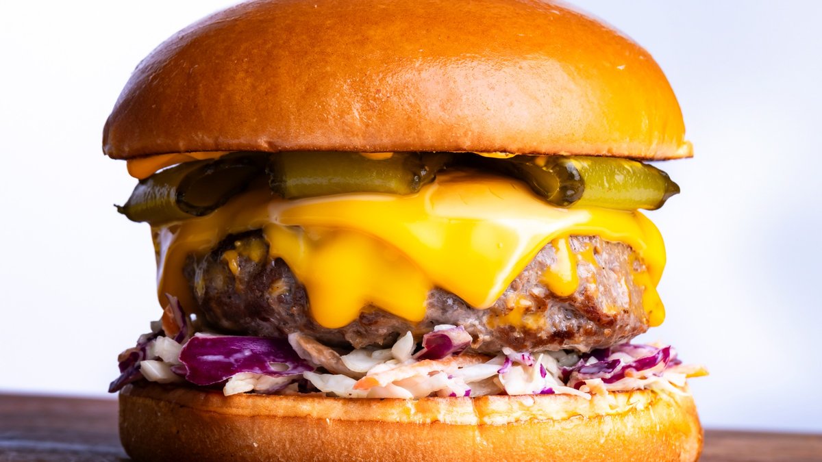 Chiflă artizanală 85 g, carne de vită 100% naturală 150 g, brânză cheddar dublu 40g, salată iceberg 20 g, castraveți murați 20g, sos burger 50 g,