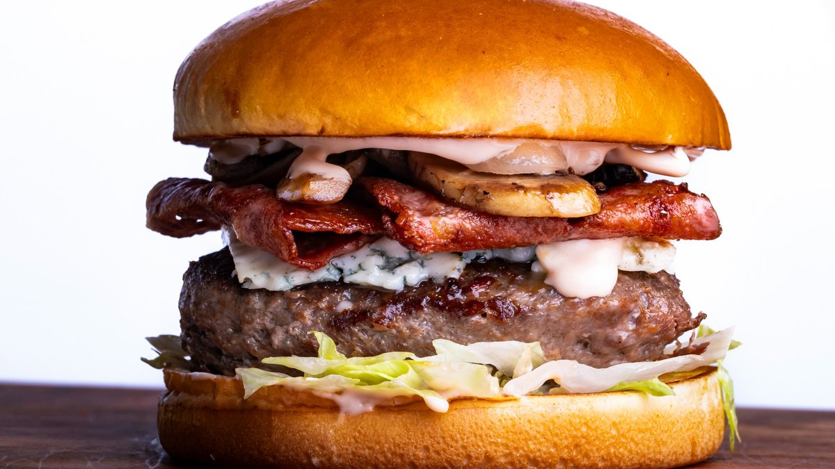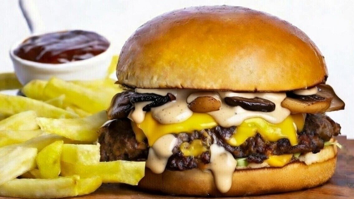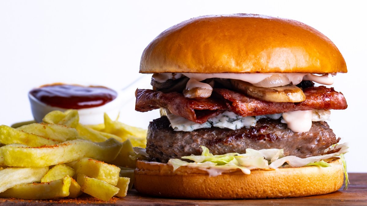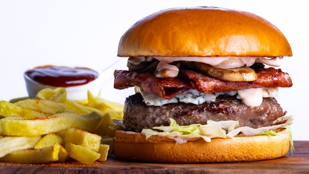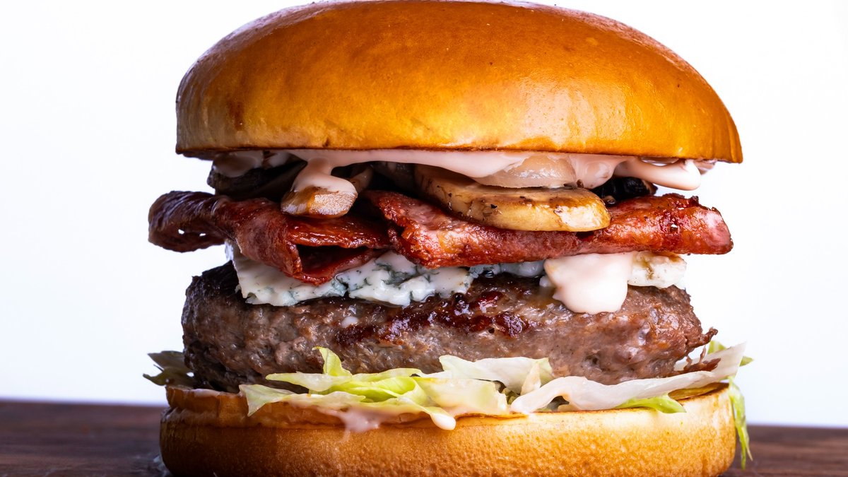 550g Chiflă artizanală 85 g, carne de vită 100% naturală 150 g, brânză gorgonzola 20g, salată iceberg 20 g, ciuperci 30g, bacon 40g, sos burger 50 g, sos la alegere 60g, garnitură la alegere 150g
