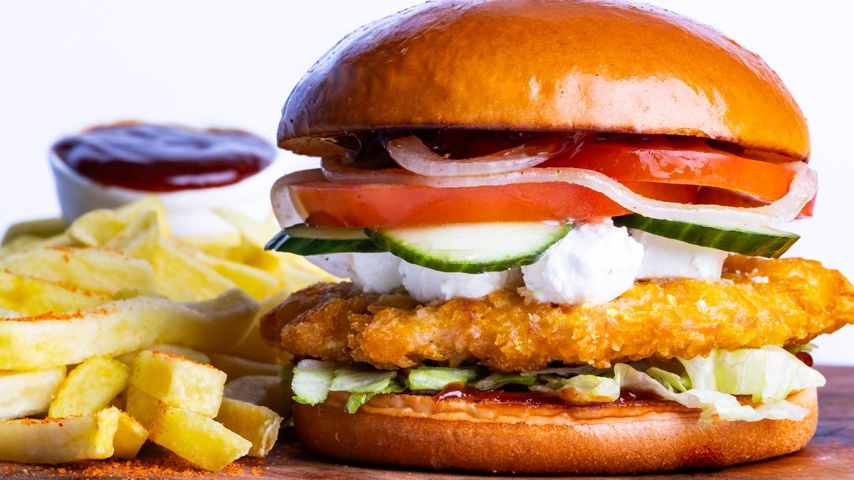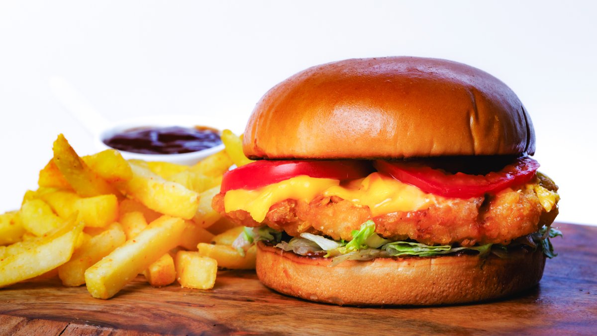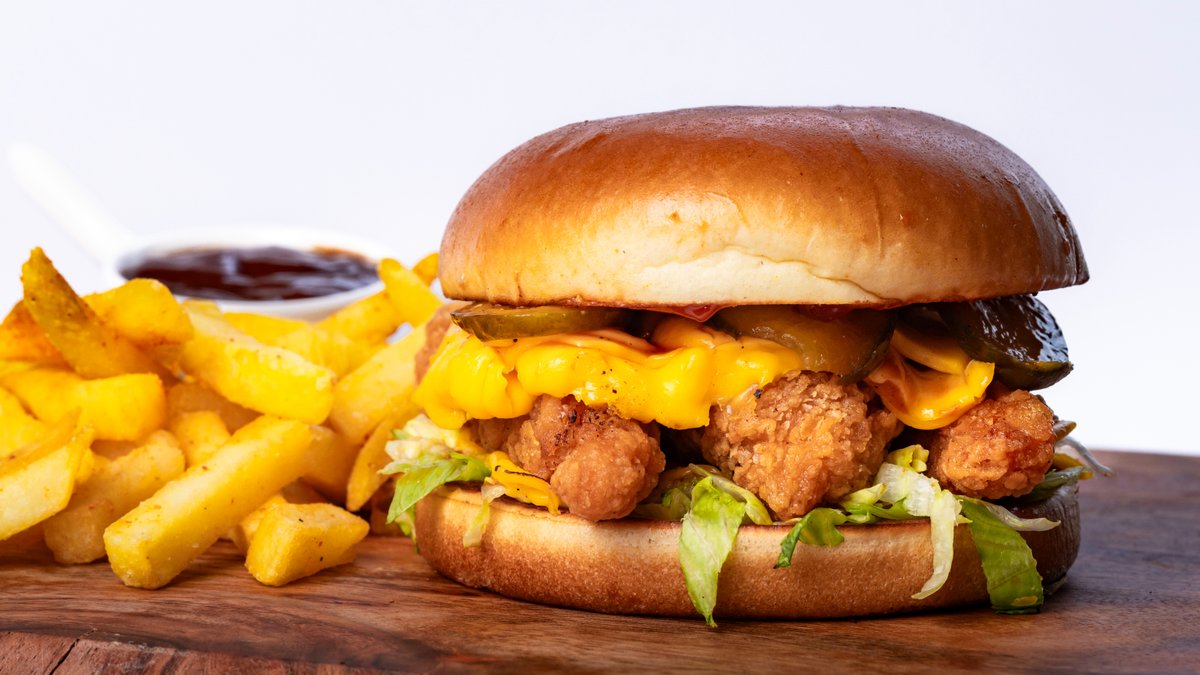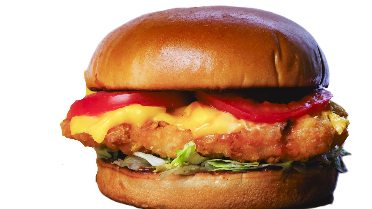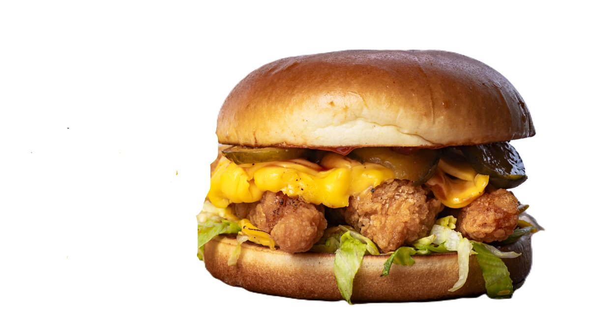 490g Chiflă artizanală 85g, snitel crocant din piept de pui în crustă de fulgi de porumb 140g, brânză cheddar 40g, felii de roșii 30g, salată iceberg 20g, sos BBQ 50 g, sos la alegere 60g, garnitură la alegere 150g