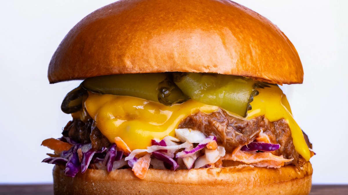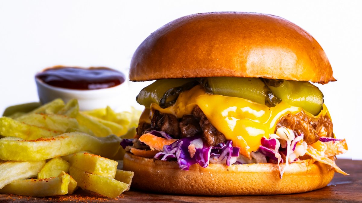 350g, Chiflă artizanală 85 g, carne de porc fragedă, gătită lent timp de 6 ore 120g, salată coleslaw 60 g, brânză cheddar 20 g, castraveți murați 20g, sos BBQ 50 g,