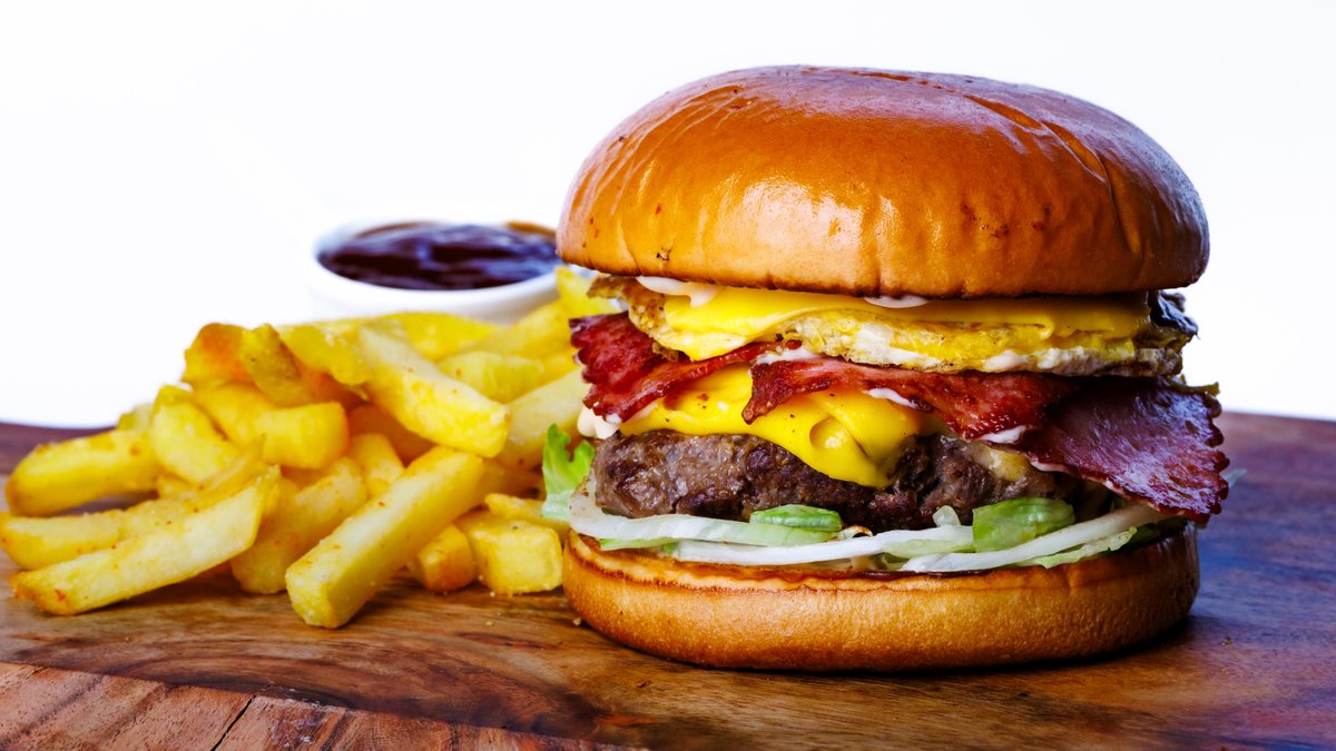 550g Chiflă artizanală 85g, carne de vită 100% naturală 150g, ou (ochi) 40g, bacon 20g, brânză cheddar 40g, ceapă caramelizată 10g, salată iceberg 20g, sos burger 50g, sos la alegere 60g, garnitură la alegere 150g