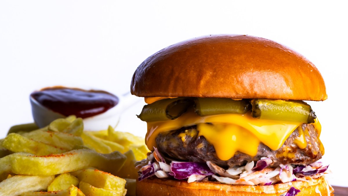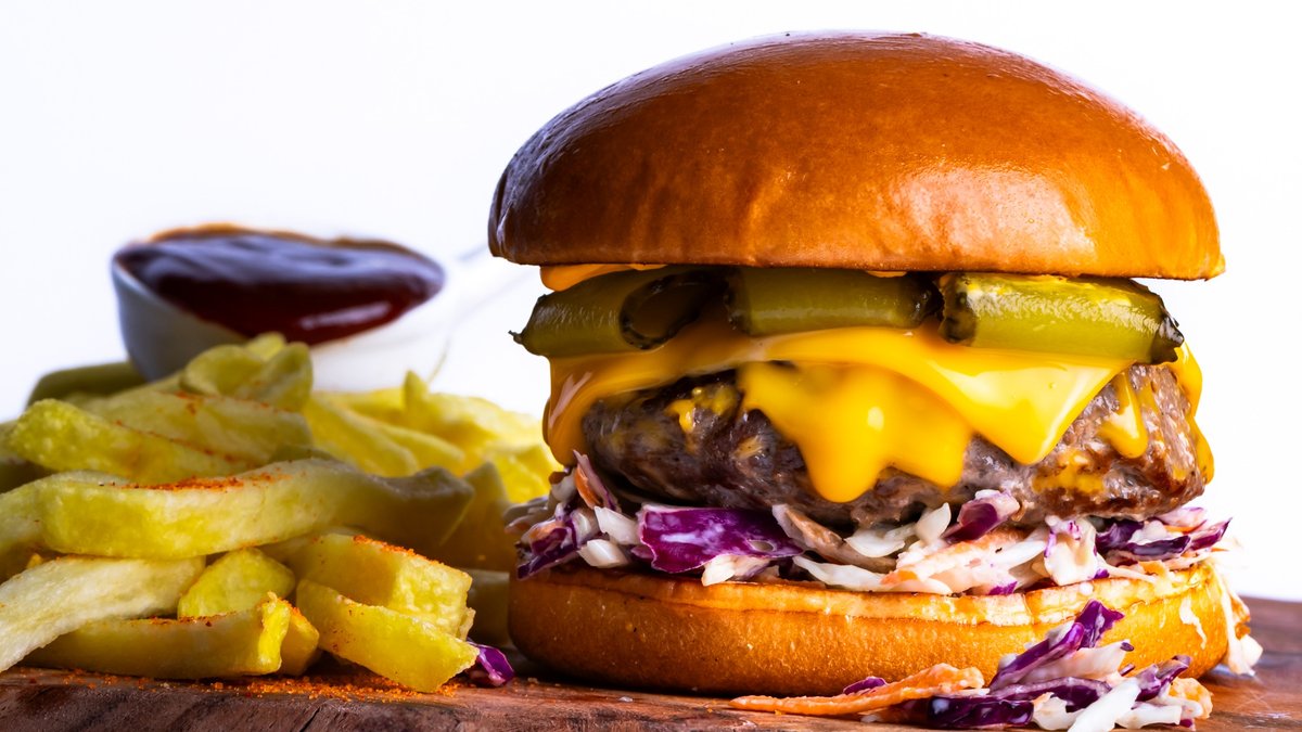 550g Chiflă artizanală 85 g, carne de vită 100% naturală 150g, salată coleslaw 60 g, brânză cheddar 20 g, castraveți murați 20g, sos burger 50 g, sos la alegere 60g, garnitură la alegere 150g