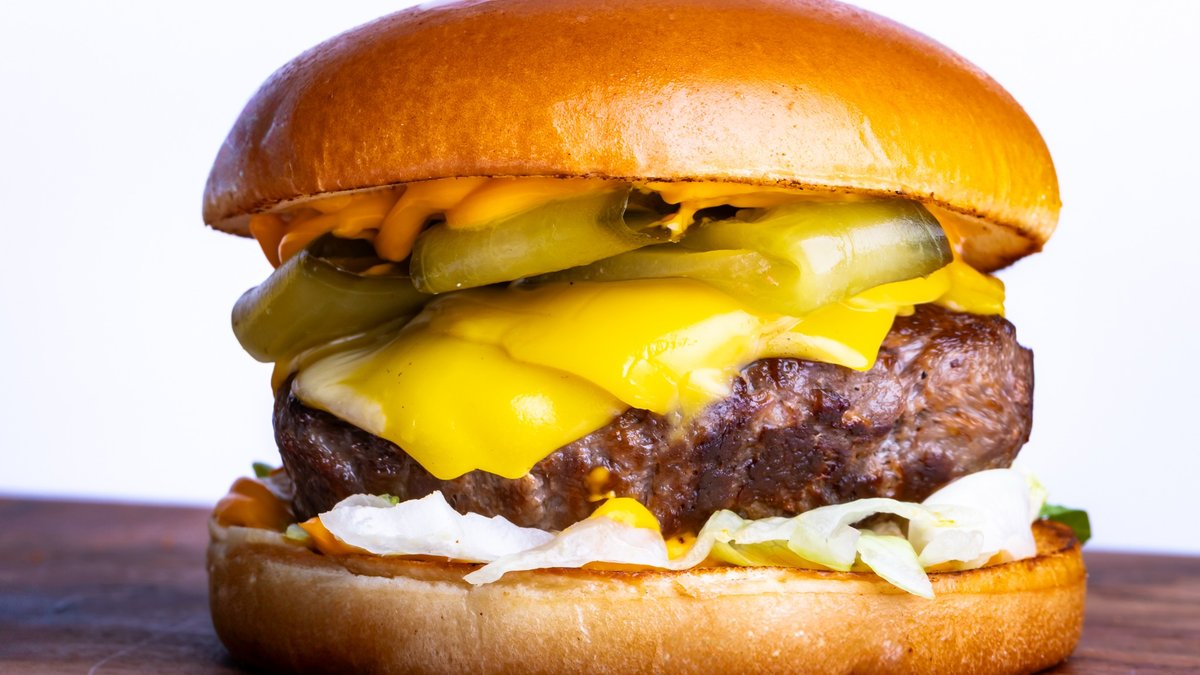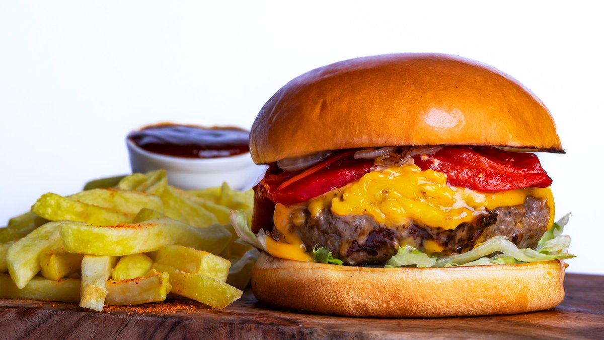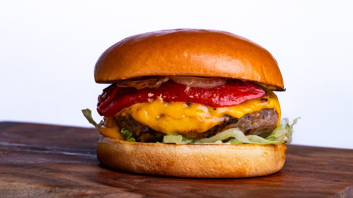 520g Chiflă artizanală 85 g, carne de vită 100% naturală 150g, ardei copți 30 g, ceapă la grill 20 g, brânză cheddar 20g, salată iceberg 20g, sos burger 50 g, sos la alegere 60g, garnitură la alegere 150g