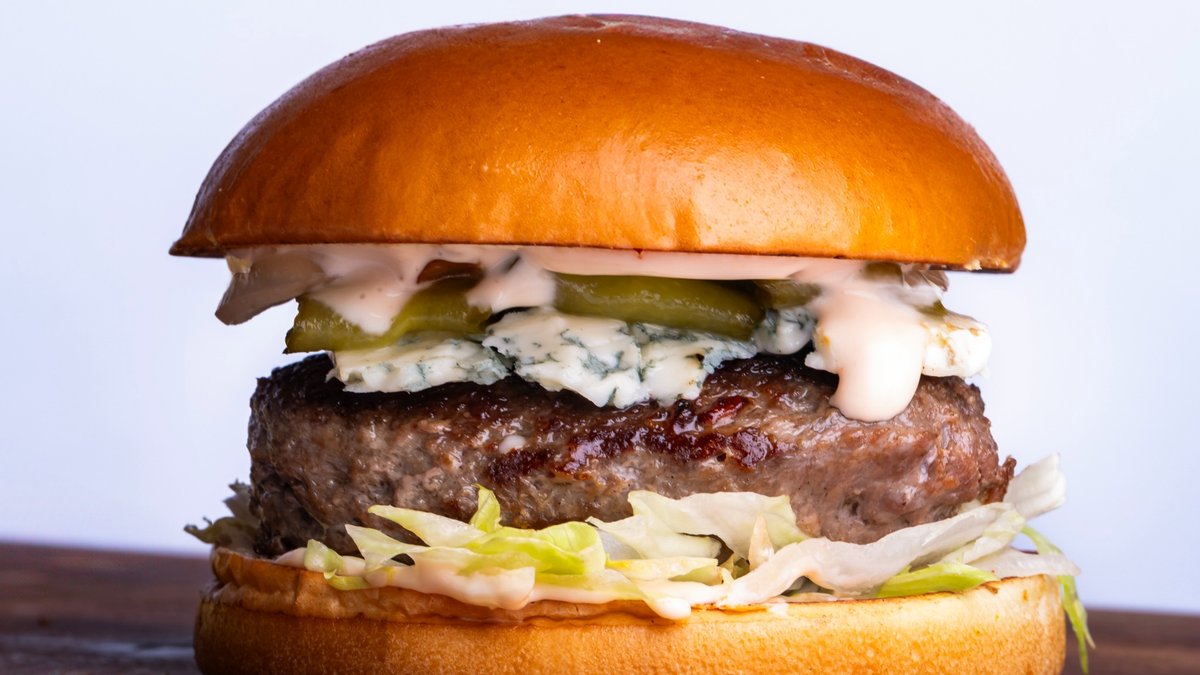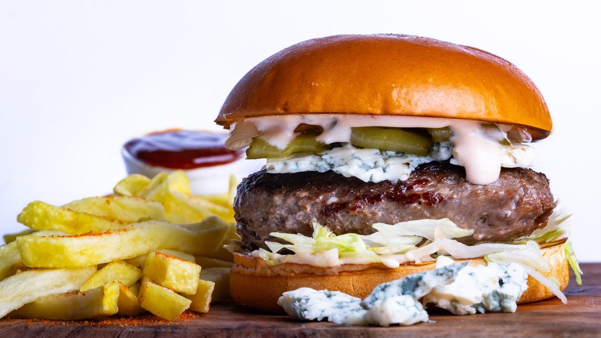 520g Chiflă artizanală 85 g, carne de vită 100% naturală 150 g, brânză gorgonzola 30g, salată iceberg 15 g, castraveți murați 30 g, ceapă caramelizată 10g, sos burger 50 g, sos la alegere 60g, garnitură la alegere 150g