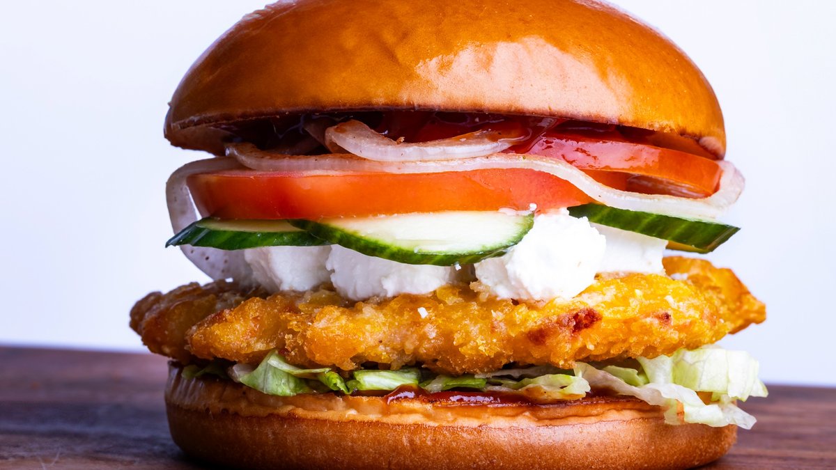 550g Chiflă glazurată cu susan și semințe de în 85g, piept de pui în crustă crocantă 120g, salată iceberg 20 g, brânză feta 40 g, roșii 30 g, castraveți verzi 20 g, ceapă 20g, sos BBQ 50 g, sos la alegere 60g, garnitură la alegere 150g