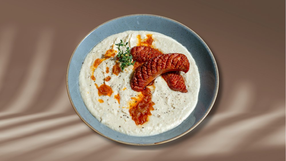 Fasole frecată cu cârnați prăjiți