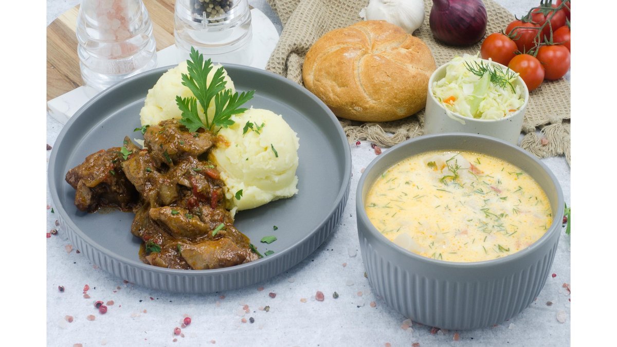 Ciorba de conopida - 400ml Ficatei de pasare cu sos de ceapa - 150g Cartofi piure cu unt - 200g Salata de varza alba - 100g Chifla - 1buc