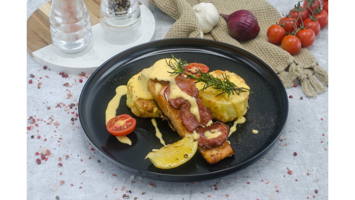 File de somon la gratar,tarta de cartofi,sos olandez si chorizo