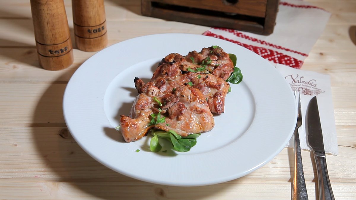 Carne de porc fragedă atent aleasă, condimente, legume, mămăligă. Pork , vegetables, traditional spices, polenta. 200/300 g
