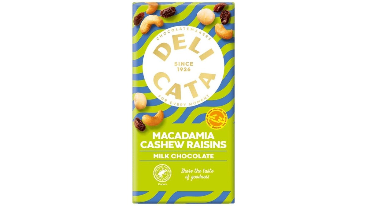 Delicata Ciocolata cu lapte cu macadamia, caju si stafide 150g
