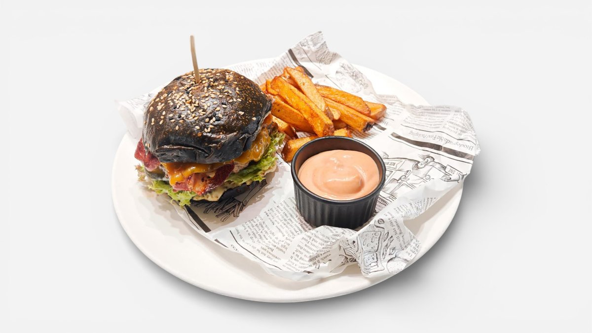 Chiflă artizanală cu carbun vegetal, carne vită de calitate superioară aromatizată în stil mediteranean, fondue de pecorino cu trufe, bacon, roșii, salată, cartofi proaspeți prăjiți și sos cocktail- 600g