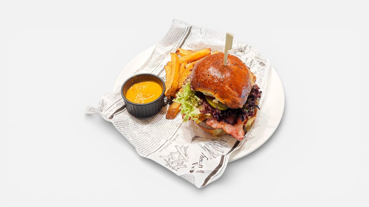 Chifle cu semințe făcute în casă (făină, zahăr, unt, drojdie, apă, ouă, semințe, sare), burger de vită (carne de vită tocată, sare, piper negru, ou, pesmet, pătrunjel), brânză afumată, castraveți murați, roșii, cartofi prăjiți și ketchup - 400g