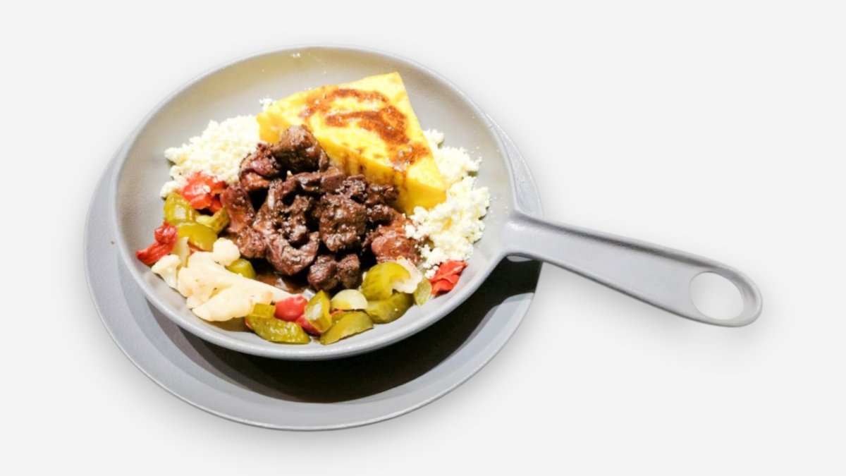 Pastramă de oaie, usturoi, mămăligă cu brânză, murături, vin roșu, unt, făină șI boia de ardei- 550g