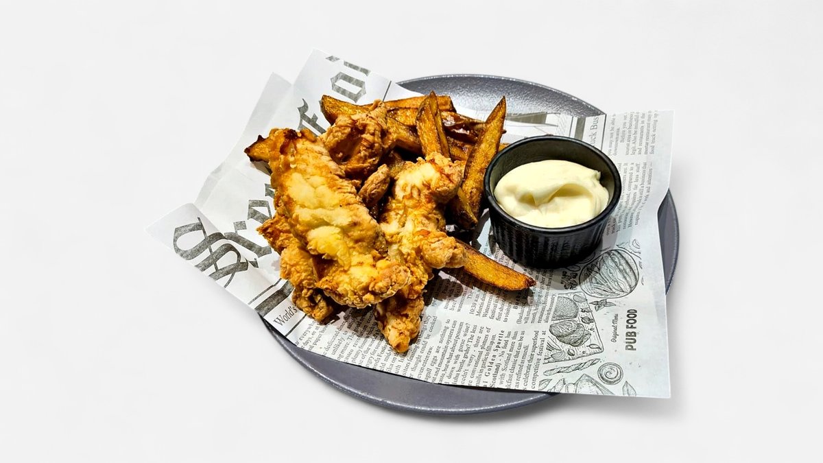 Cartofi proaspeti prajiti, file calcan, pesmet panko, faina 00, oua de gaina, ketchup, condimente -350g