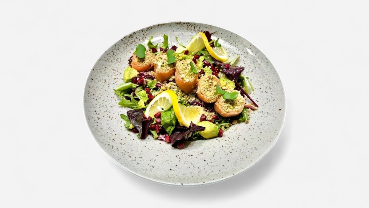 Mix de salata, somon afumat umplut cu crema de branza aromatizata, rodii, afine si fructe lemnoase. - 400g