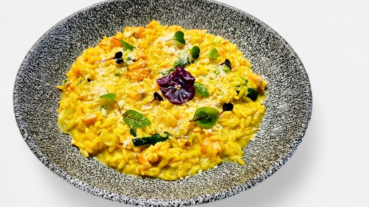 Orez carnaroli, file de somon, branza capra, somon afumat, ulei de masline, unt 82%, ceapa, grana padano, usturoi, chives, sare, piper - 450g