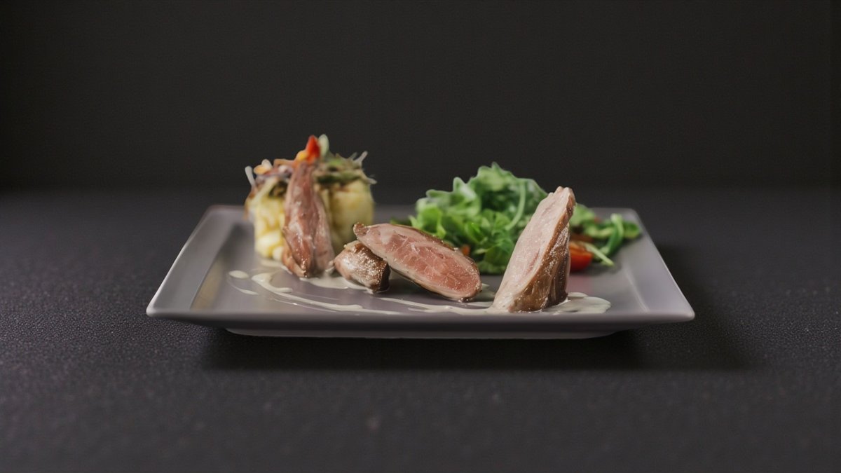 Pulpă de rață confiată în grăsime proprie, varză roșie caramelizată, cartofi cu sos bechamel (cartofi, lapte, unt, făînă, sare, piper negru, nucșoara, oțet, pătrunjel) șI sos de smântână cu piper verde- 550g
