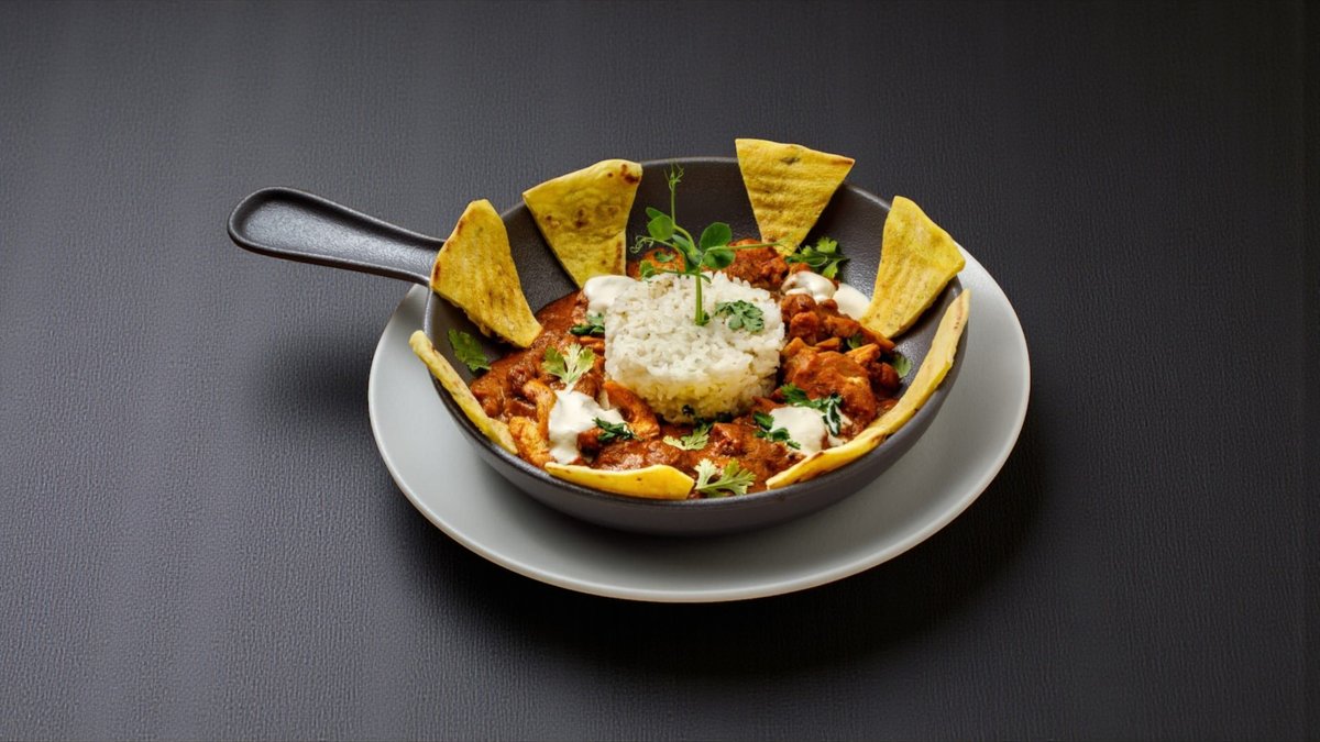 Pulpe de pui dezosate, garam masala, curry, sos de roșii, smântână, usturoi, coriandru și pâine naan (făină, iaurt, apă, chimen, curry, curcuma, coriandru, unt)- 550g
