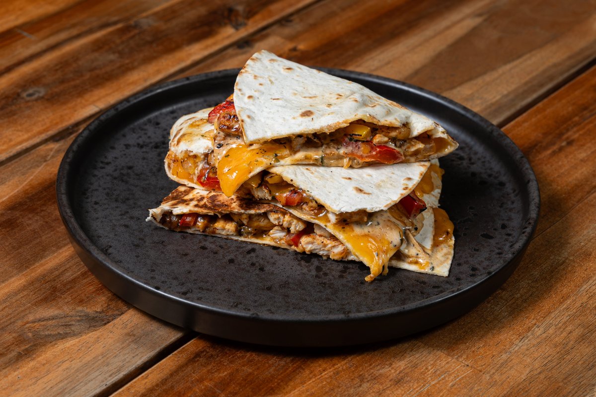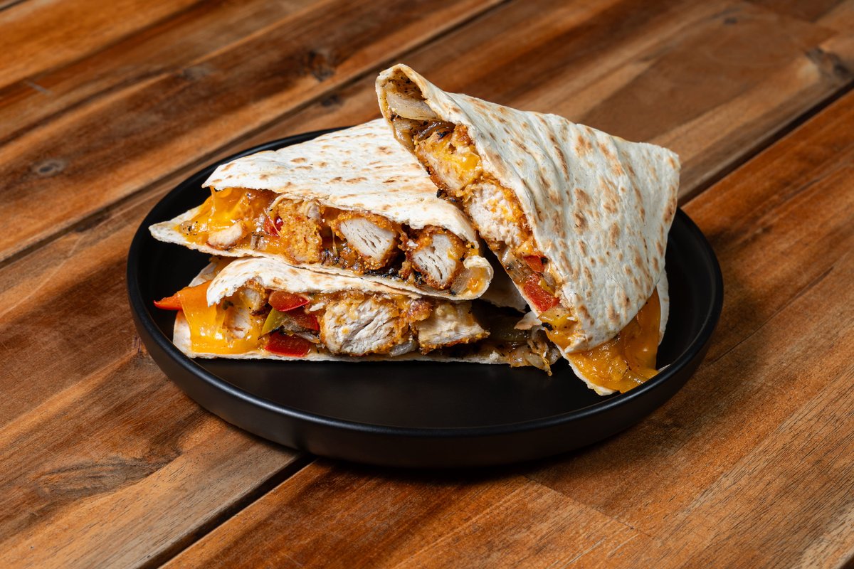 Tortilla 60g, ardei 30g, ceapă 30g, piept de pui 110g, cheddar 50g, sos 50g (sos la alegere). Total 330g.