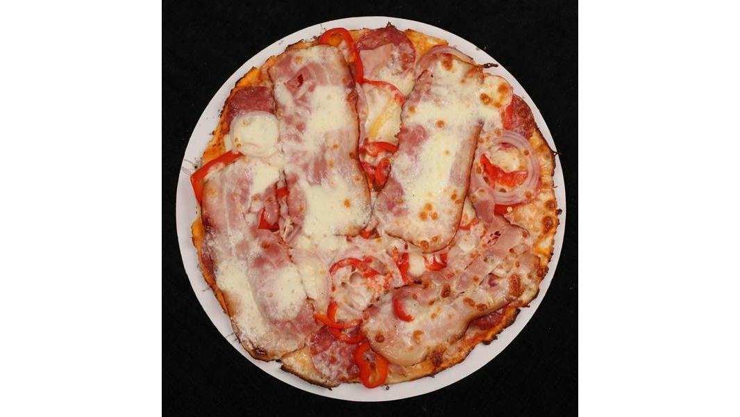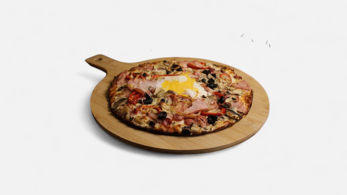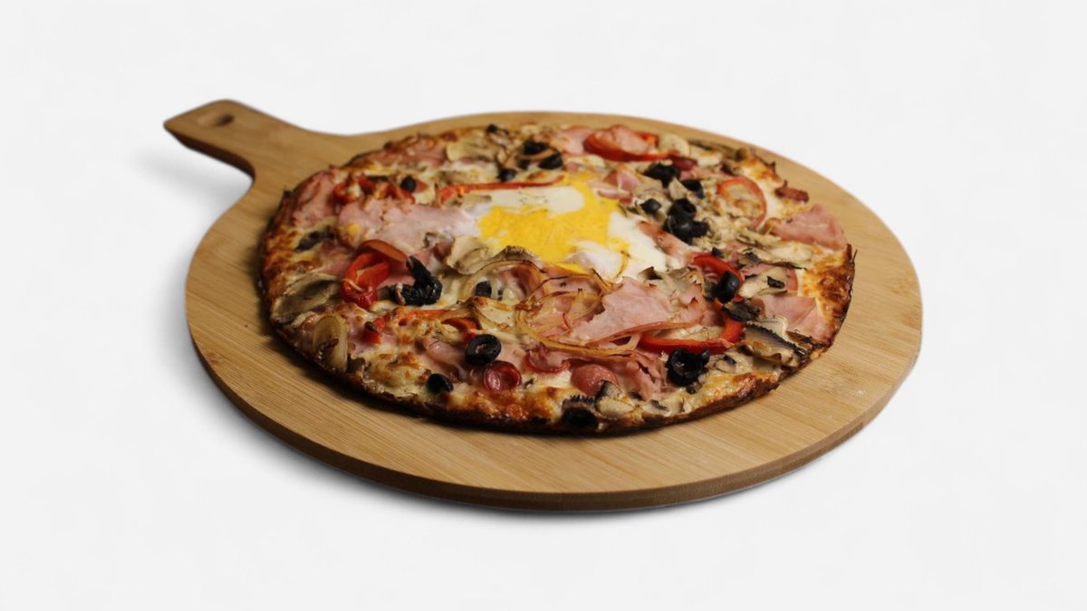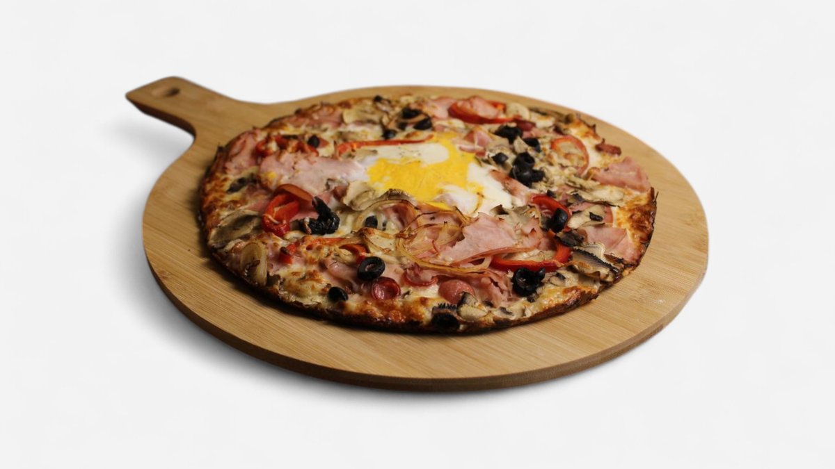30cm Blat, sos rosii, mozzarella, salam, sunca, ceapa, ciuperci, carnati, ardei gras, costita, ou capac, masline