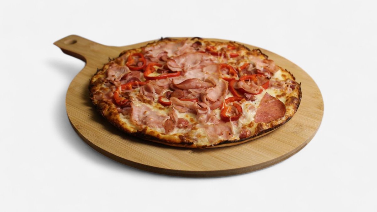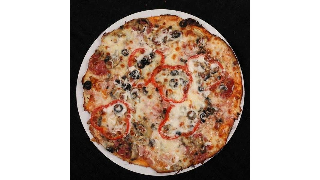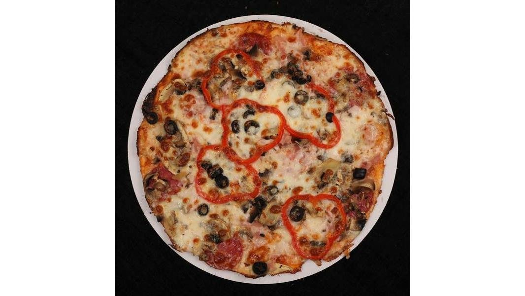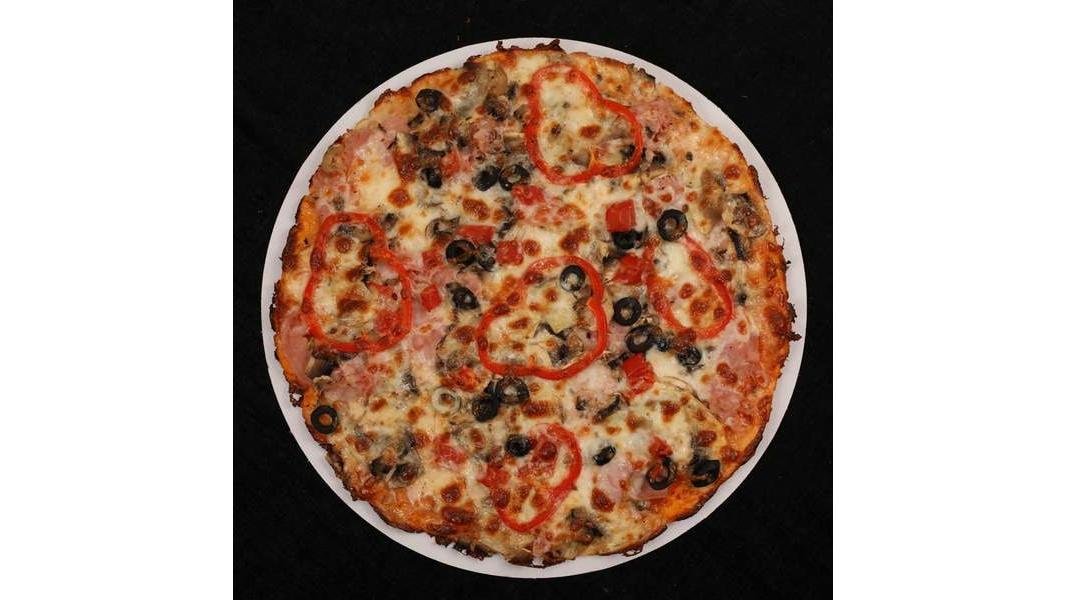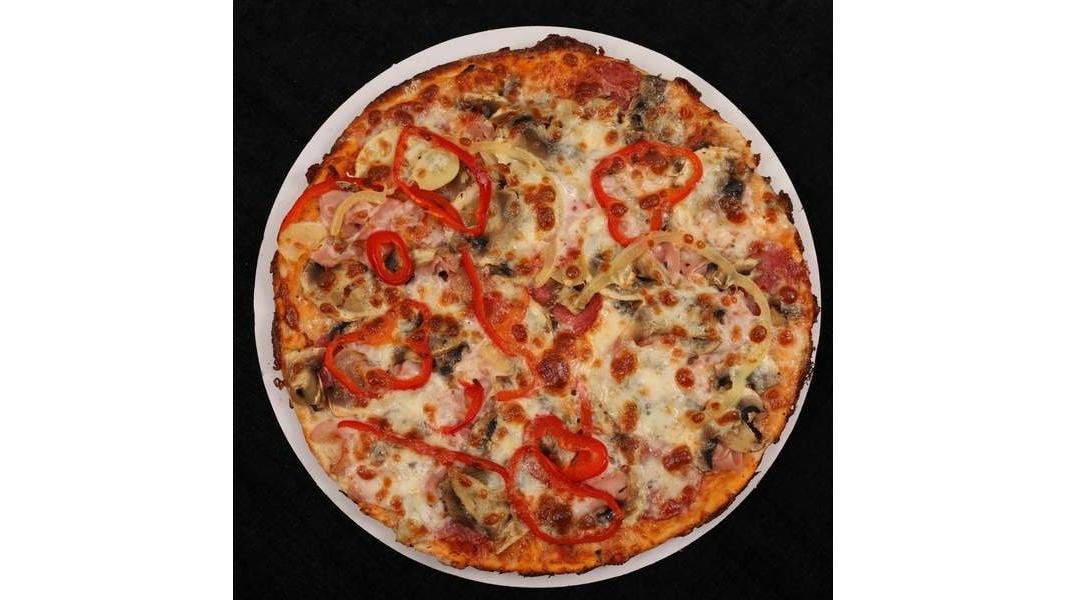30cm Blat, sos rosii, mozzarella, salam, sunca, ciuperci, ardei gras, masline, cascaval