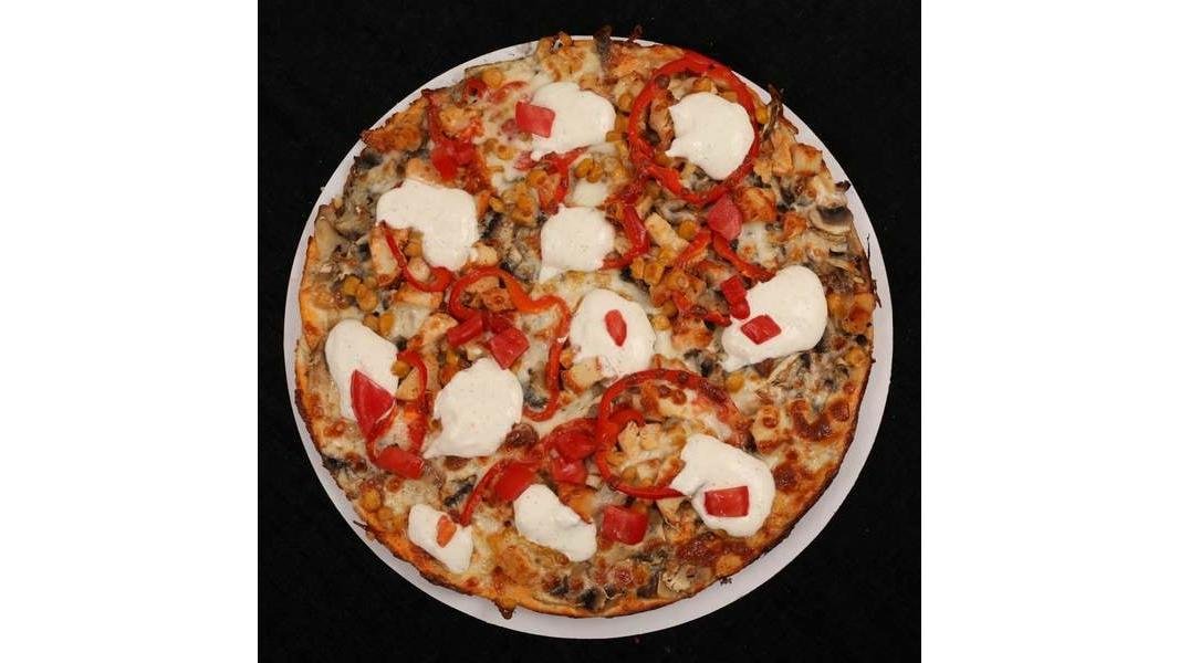 30cm Blat, sos rosii, mozzarella, piept de pui, ciuperci, ardei gras, porumb, sos alb, rosii proaspete